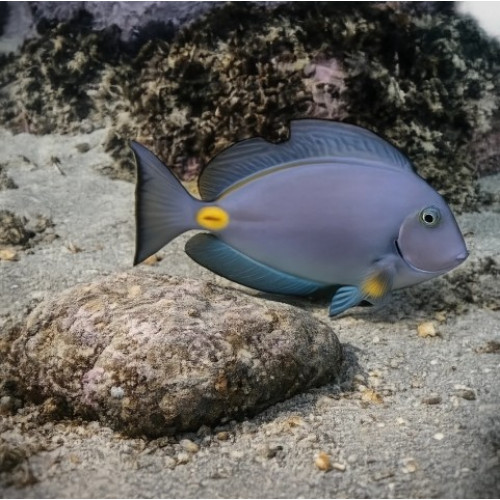 In the Monrovia doctorfish, there is an area of bright yellow around the orange spine on the caudal peduncle. In the center of the spots are sharp, stiletto-like spines. At the fish's will, they can be flattened or erected. If a predatory fish from a swimming school attacks a Monrovia doctorfish and, after seizing it, spits it out with a startled movement, then the other predators will subsequently avoid fish with an orange spot near the tail. Evidently, this warning coloration helps the owner survive.